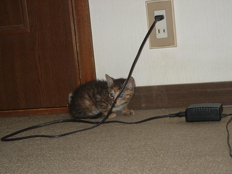 この写真は、その日に撮ったと思います。はじめて連れてこられてキョロ、キョロしていました。駅で始めてみくを見た時あまりにもちっちゃくてかわいくてビックリしました。電車のなかでずっと鳴いていたそうです。9匹もの姉妹達やお母さんねこちゃん達をさがして鳴いていたのかもしれないですね。(コロとの対面は明日叉アップ)